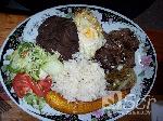 a 'picadillo' (finely chopped vegetables such as potato, chayote (a type of squash), banana etc) and a salad (usually green), slices of ripe plantain, cheese, and egg.